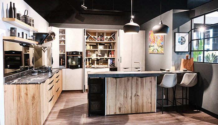 Spanning 300sq m, the showroom houses 6 kitchen displays with complementing interior solutions. Appliances from brands including Bora, Neff and AEG, which has already hosted a couple of live cooking demonstrations in the showroom, are on display alongside sinks and taps from Quooker and Blanco with work surfaces from Cosentino.