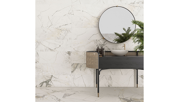Tile drenching can make spaces feel larger and lighter, adding a sense of harmony and flow creating a seamless, uninterrupted appearance. Using large format tiles can deliver a more sleek, spacious look when covering the walls and floors, perfect for modern and minimalist spaces, whereas small format tiles will add detailing, texture and more visual interest to a room.