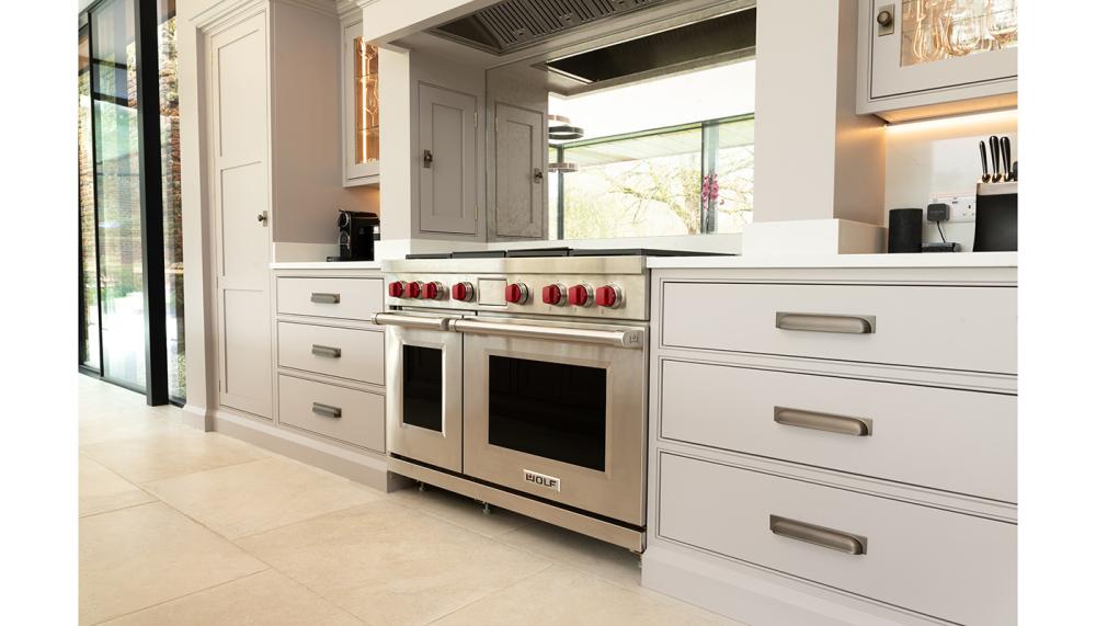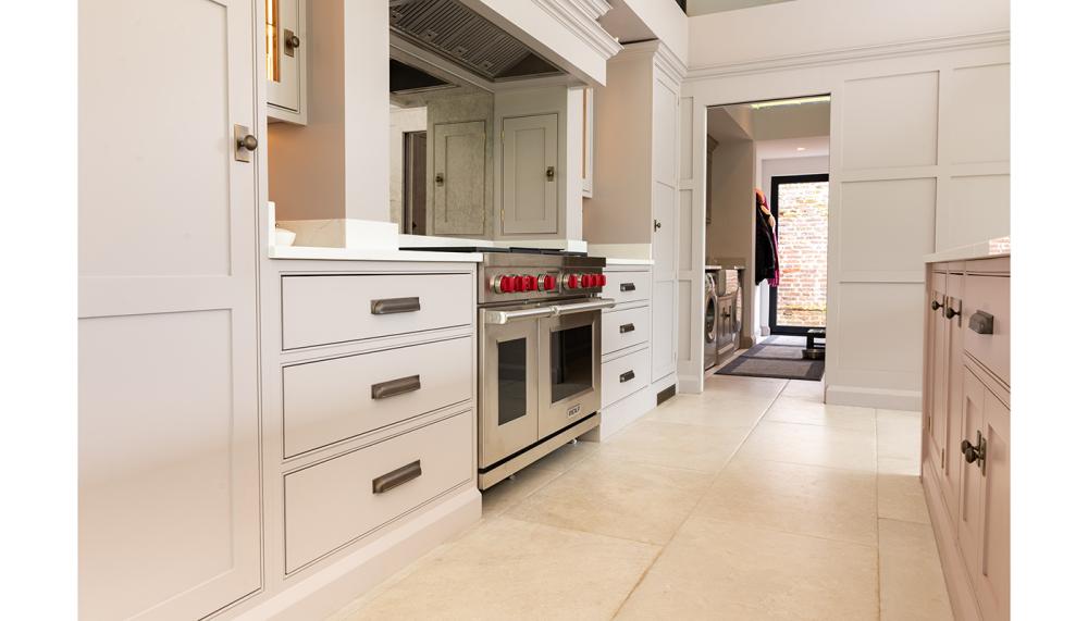 A: We implemented our Bespoke Mapesbury handleless cabinetry, to achieve a classically beautiful look that the client wanted. This refined take on classic design perfectly aligned with the client's desire for ornate yet stylish cabinetry, contributing to the overall grand feel of the property. All of our cabinetry is made by hand in our own workshop in Essex, giving us complete control over the design and manufacturing process. We take particular pride in developing custom and prototype pieces, ensuring that every kitchen we create is as unique as the people who live in it. For example, for this project, we made personalised pull-out shoe racks for the boot room and wardrobes which were tailored to particular shoes owned by the clients.
