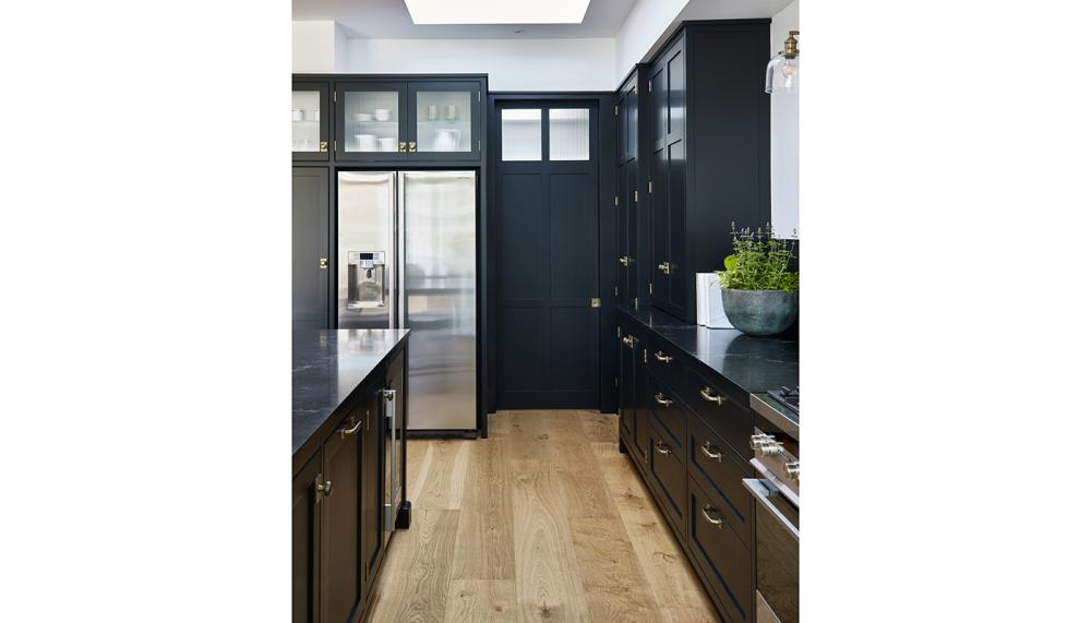 At the heart of this reimagined space is a monochromatic open-plan kitchen by bespoke kitchen makers Kate Feather, where Caesarstone's 5100 Vanilla Noir surface takes centre stage. With its rich jet-black base and creamy, off-white veining, the surface delivers a high-impact visual statement, bringing depth, drama, and elegance to the design. More than just a beautiful feature, it also sets the tone for the wider material palette and layout – anchoring the entire scheme.