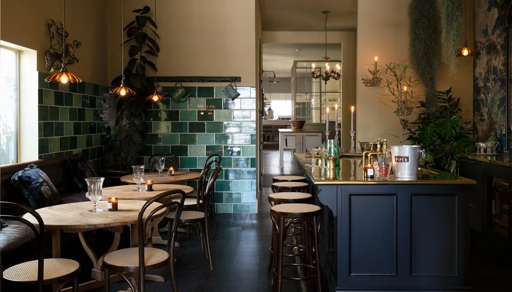 DeVOL recently made its first, well received, foray into bathroom design, so here, peeking through a pair of vintage French doors is the powder room. A little moodiness from the bar outside flows in, with a full wall of DeVOL's Sepia Lace Market Tiles, but the floaty cafe curtains and quirky pendants make this room feel distinct, nostalgic and a little bohemian.