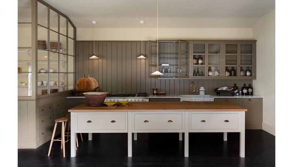 To celebrate the opening of the West Coast showroom, DeVOL decided to add 3 new colours to its paint range, all of which can be sees in the Shaker kitchen. The tongue-and-groove panelling and perimeter cupboards are painted in 'Folgate Green', an earthy olive bronze, the prep table is 'Quaker Cream', a rich clotted cream shade, and the bench seat is 'Minton Buff', a dusty green yellow.