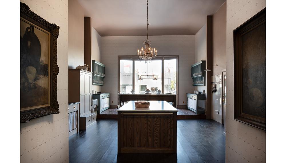 Stepping down from the terracotta floored window display, the visitor enters a spacious, airy room with a soft and delicate palette of colours. This big space, and the design of this kitchen, is reminiscent of under-the-stairs kitchens in English stately homes. The idea was to showcase the function and practicality of the generously proportioned cupboards without creating an austere feeling, so the soft, barely there, plaster-coloured walls were key to this space working.