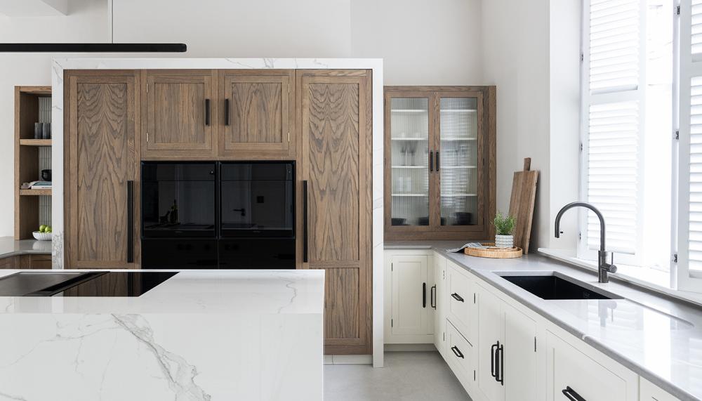 Lewis explains: “Natural oak cabinetry has been a popular choice for my clients this year as we see more homeowners opting for natural materials that can be paired easily with other design elements. Particularly whitewashed ash which provides contemporary character while highlighting craftsmanship quality. The versatility of wood means cabinetry in this material can be really striking on its own paired with a white-toned stone worktop; or alternatively matched in a duo-toned kitchen with complimentary mushroom colours. Incorporating fluted glass-fronted cabinets and brushed brass handles add further tactility and layering that elevates the hand-crafted feel of the kitchen.”