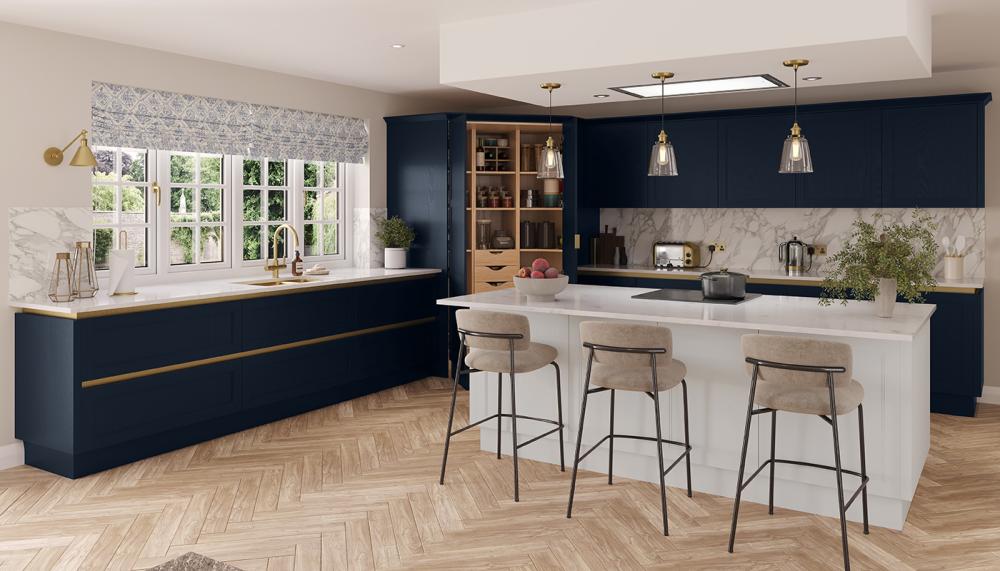 Slim shaker kitchens remain an enduring interior trend, offering a new take on the traditional design with a sleek modern frame. A twist on the classic shaker style, Verona handle-less is showcased in a vibrant deep blue and subtle light grey, complete with eye-catching brushed brass profiles.