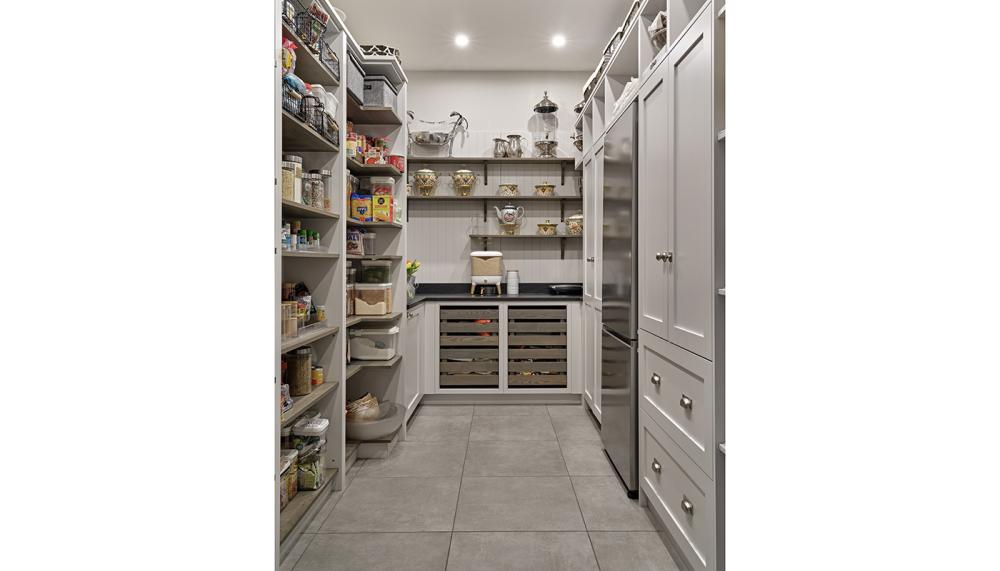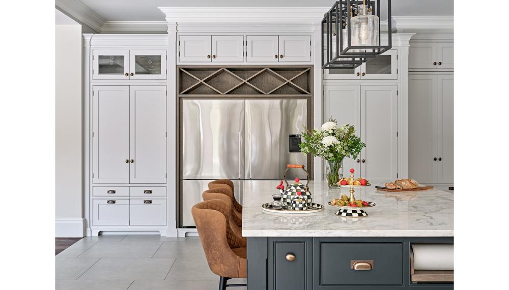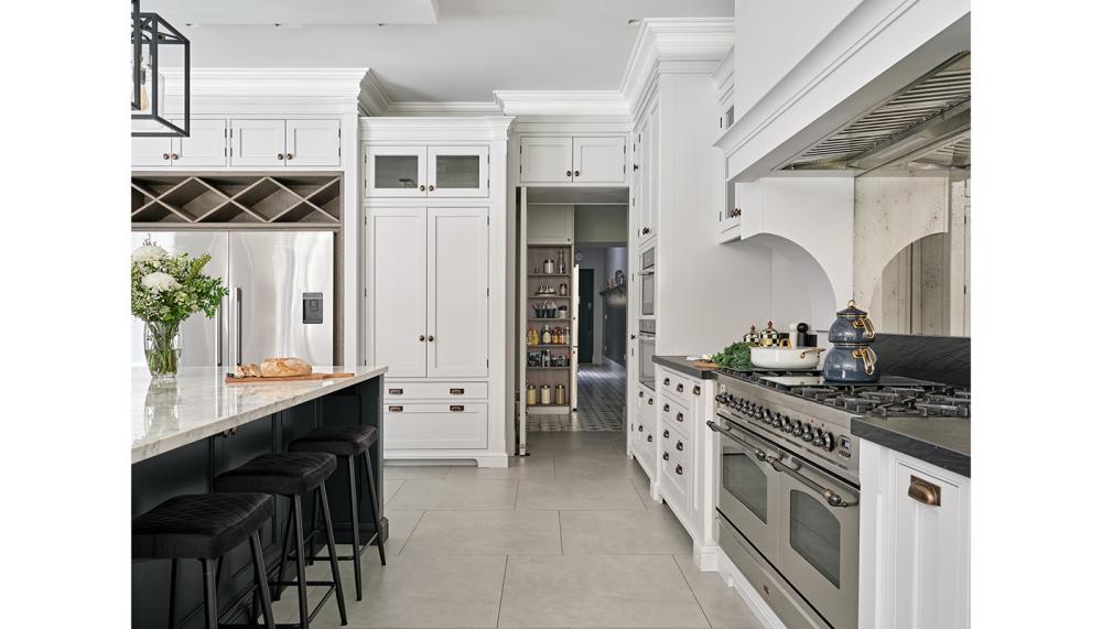 A: The brief was clear: the clients wanted a classic kitchen that felt luxurious but not overly formal. Storage was a key priority, particularly concealed storage, alongside a dedicated pantry and drinks area to keep the main kitchen clutter-free. They also wanted a strong sense of symmetry, practical work zones for everyday family life, and a space that would age beautifully rather than follow short-term trends.