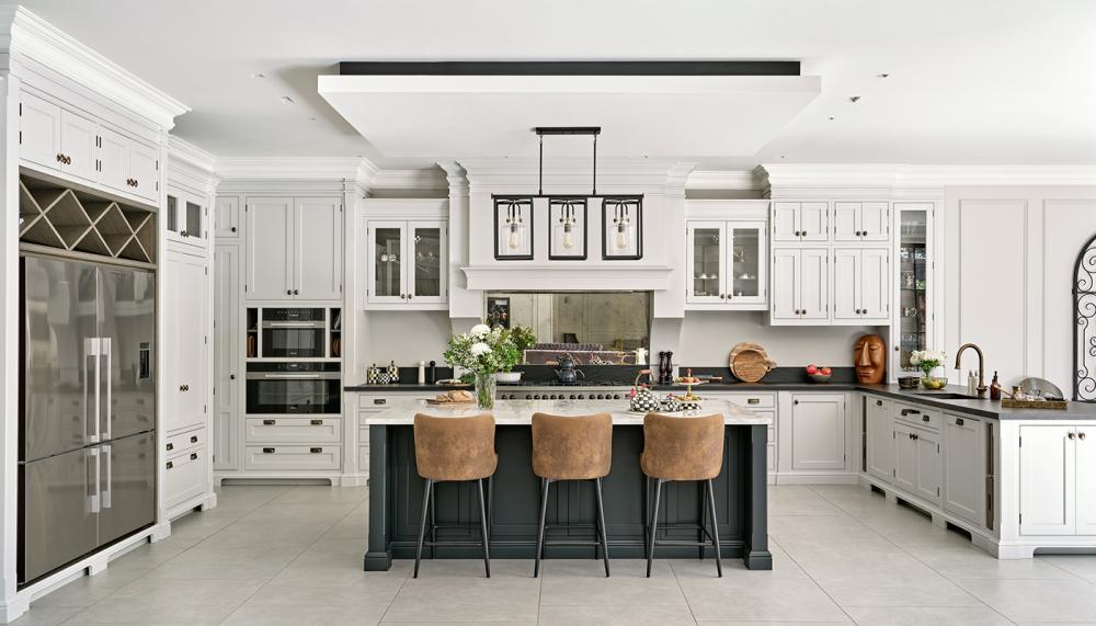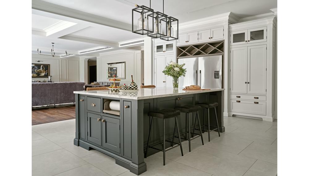 A: We focused on strong architectural balance, layering classic detailing with modern functionality. The layout was carefully planned to ensure generous circulation space while keeping all working zones intuitive and efficient. We introduced an oversized island as the focal point, combining seating, storage and preparation space, while secondary areas such as the pantry and appliance cabinetry were designed to discreetly support daily use without visually overpowering the room.