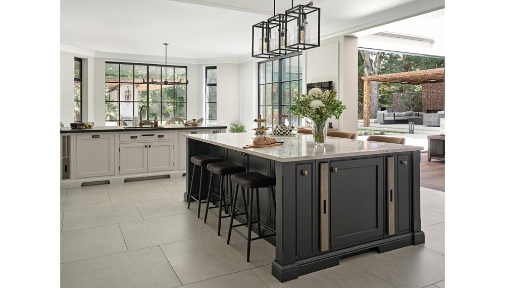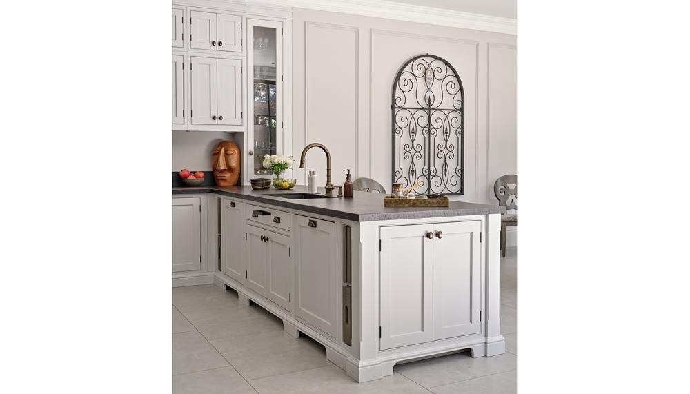 A: A soft painted finish was chosen for the main cabinetry to enhance the timeless feel of the space, paired with a darker island to ground the design visually. The worktops were kept deliberately understated, allowing the cabinetry and detailing to take centre stage. Internally, we introduced contrasting timber finishes within feature cabinets, the pantry and the drinks station to add warmth and depth, creating moments of interest when doors are opened.