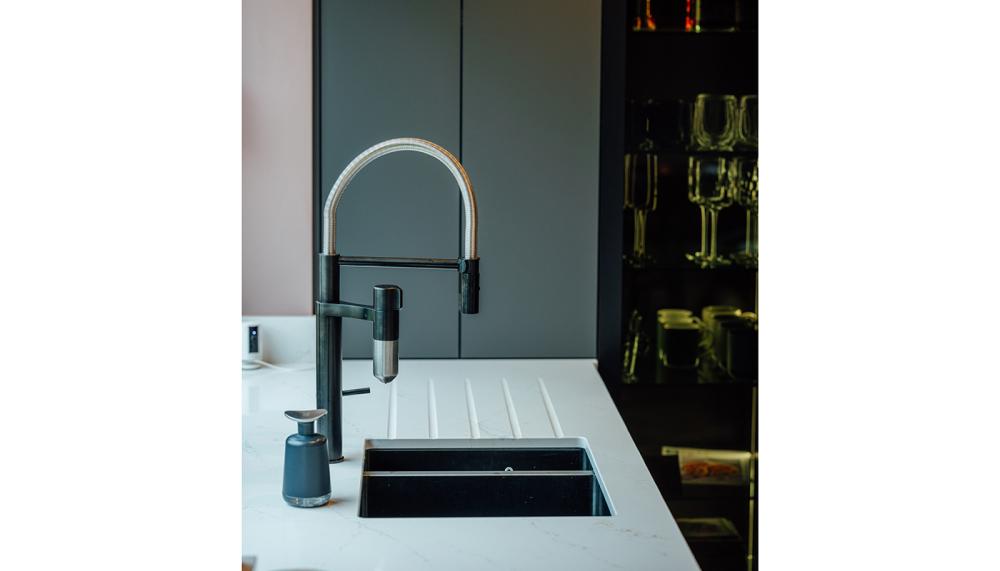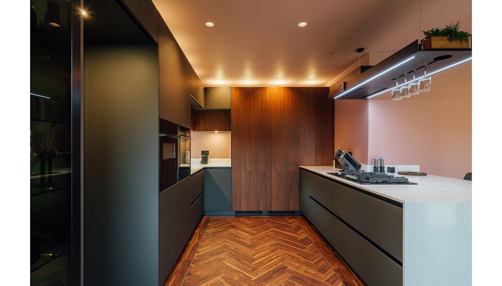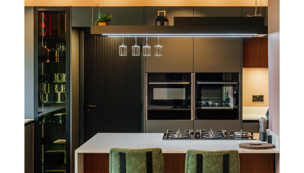 The combination of Rotpunkt’s walnut fluted doors and matte carbon grey cabinetry helps to ground the space and bring an organic warmth, which blends modern minimalism with comfort and sustainability. To provide contrast and continue the use of natural, tactile materials, we paired the dark grey base units with Silestone Ethereal Glow quartz worktops that present a polished white marble look with elegant shades of gold and grey across the kitchen surfaces and waterfall style end panel.