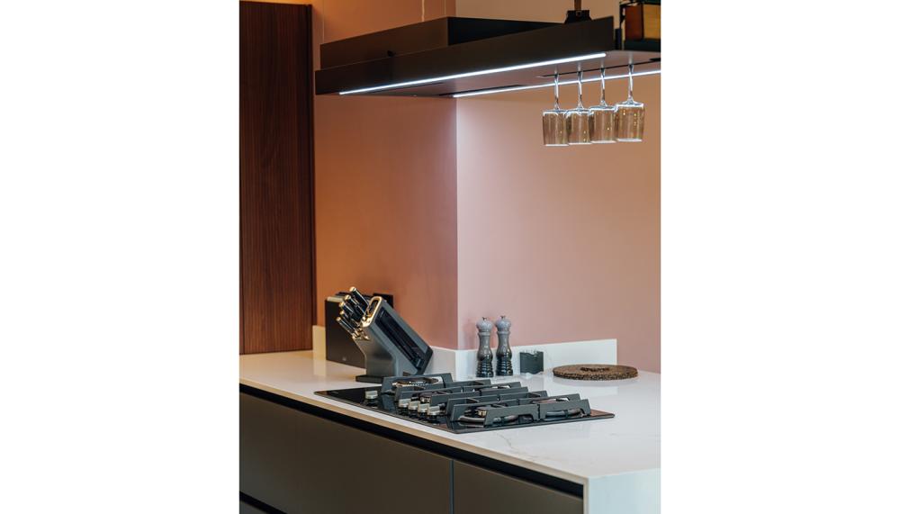 A Franke Capsule filter tap adds everyday convenience and luxury in the kitchen, as the Cox family can enjoy filtered cold water on demand, while saving them time and money over the long term. The Miro Elysium floating ceiling hood suspends overhead, which helps to keep the kitchen area feeling light, airy and in keeping with the open plan living space.