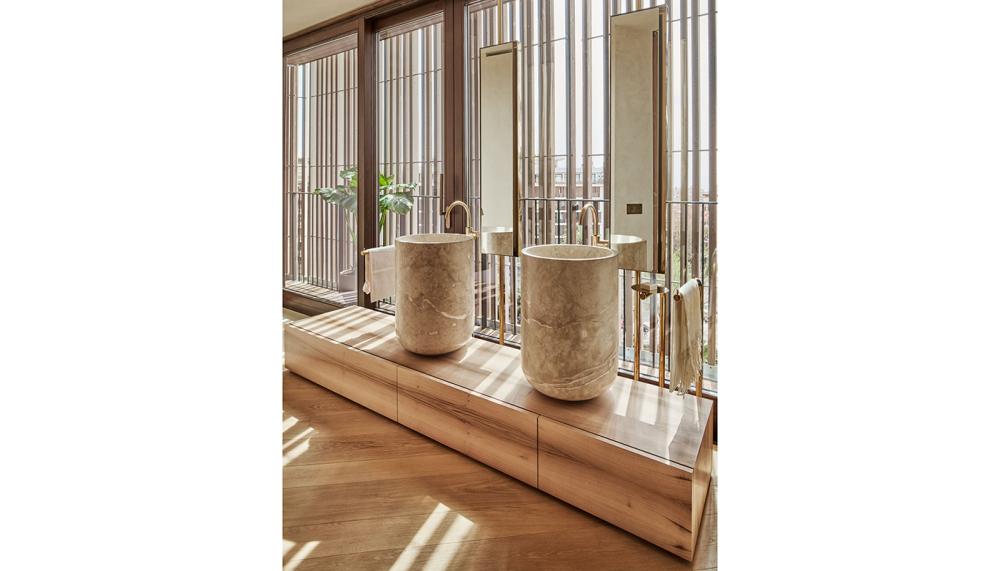 Light-filled bathrooms with iridescent material touches create an interplay between water and light, leading to holistic luxury. Fittings witih hammered metal handles or fluted glass elevate with understated ambience in the bathroom.