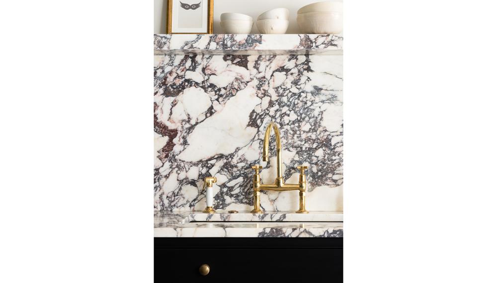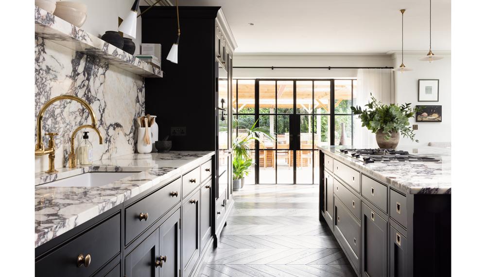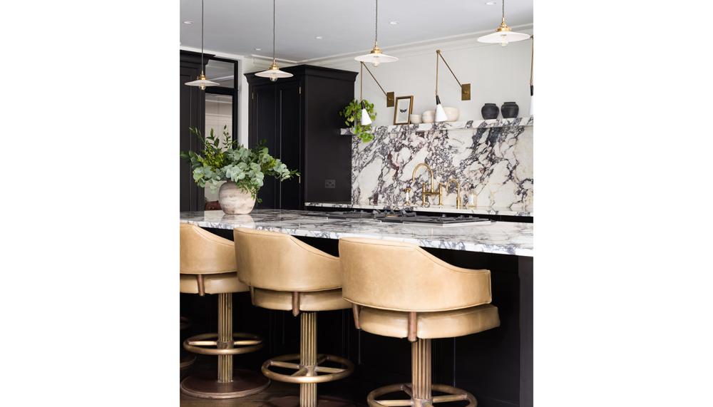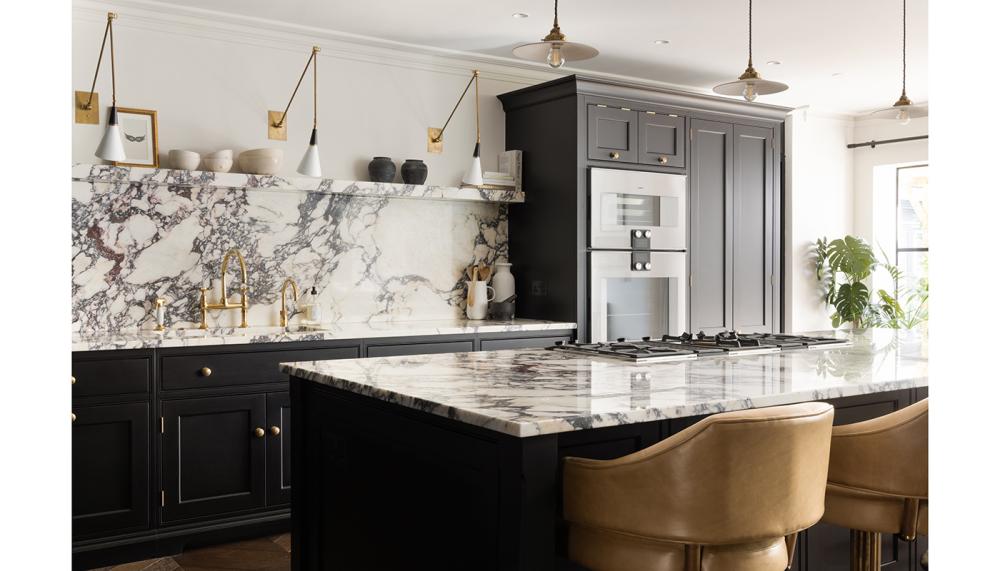 Calacatta Viola marble takes centre stage featuring on the island, splashback and shelf, while Nickleby cabinetry is finished in Humphrey Munson's bespoke colour Mr Banks – a dark, rich and luxurious tone. Hardware is a mix of bespoke Pip knobs and Walpole handles in mid antique waxed brass, both exclusive to Humphrey Munson.