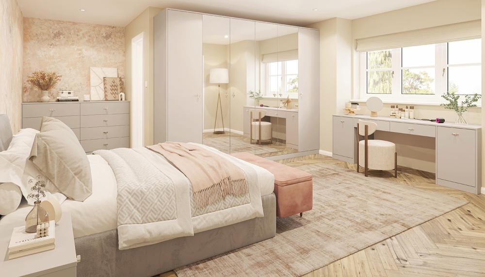Perfect for retailers looking to create an elegant bedroom scheme in 2026, Uno offers a contemporary choice of nine subtle shades. Uno is styled in Taupe and features a host of versatile storage options including a luxury mirrored centrepiece, dressing table and drawers to achieve a seamless feel.