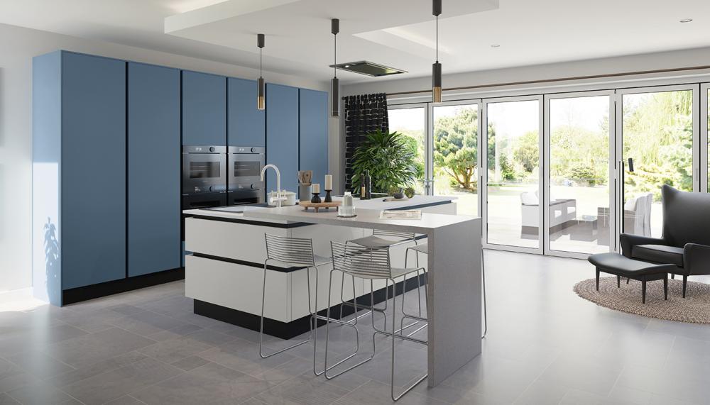 Style and smart functionality combined, Uno is styled in an eye-catching calm blue cabinetry and includes an innovative SpaceTower™ storage solution. The central island is showcased in a complementary soft pearl finish, serving as a hub for informal dining and enjoying garden views. The modern design is completed with black handle-less profiles and matching plinths.
