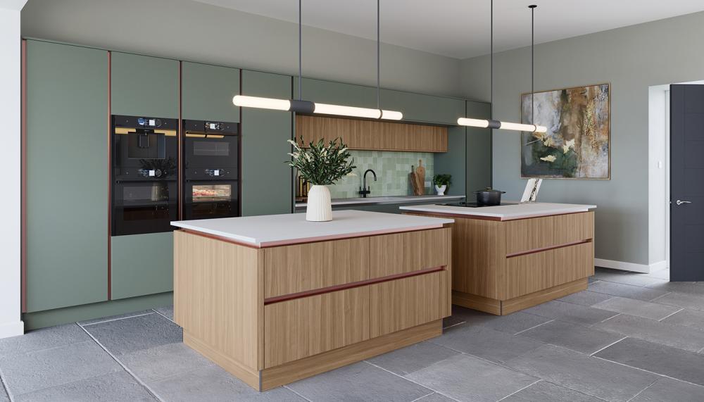 Green has long held an enduring appeal in kitchen design, and Uno is presented here in a sleek reed green statement appliance wall, beautifully paired with Textura walnut light woodgrain effect. Taking centre stage, the dual islands create defined zones for cooking, preparation and ample storage, whilst allowing easy access to flow around the kitchen space.