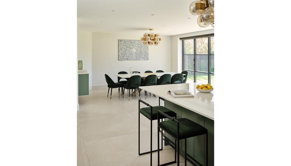 A: We decided to keep the island clear so it would be a place for food preparation, serving and social seating showcasing it as a statement in the space with an attractive waterfall design feature. We then created an attractive bar area in the same space as they liked to host parties and integrated the dining room joinery to match the kitchen. Initially the client wanted the cabinetry to be in a modern in a neutral tone, but they saw examples of how we could create elegant green cabinetry, they decided that a vibrant pop of colour would add character.