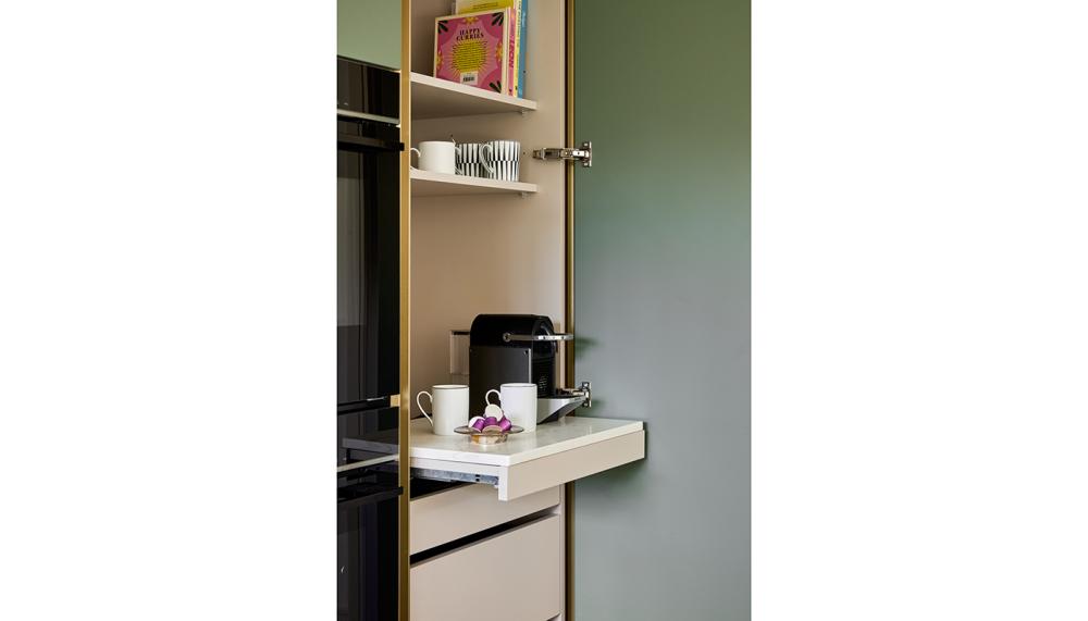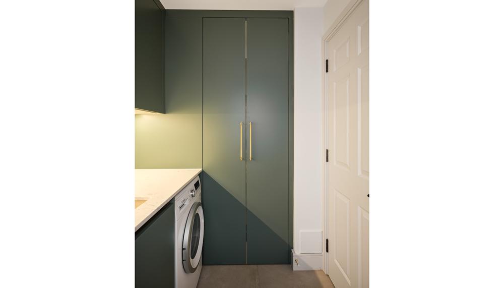 Internal storage and making sure everything had a home was a key design consideration. We placed a pull-out cabinet besides the hob to house all of the cooking oils, 2 large sets of drawers on the island which was excellent for all serving-ware. The tall larder was designed to place all dried foods which was easily accessible from the cook zone and close to the fridge.