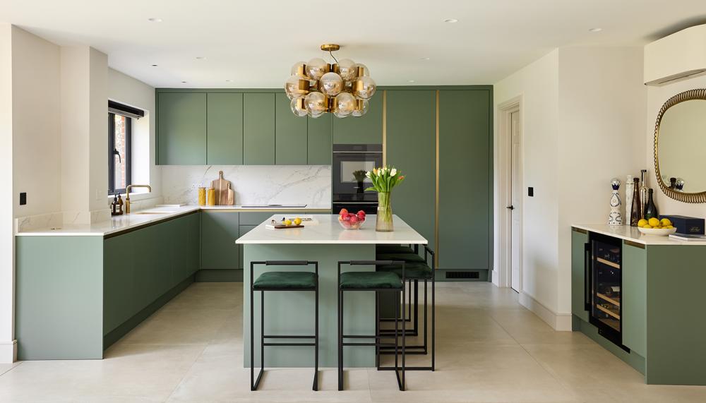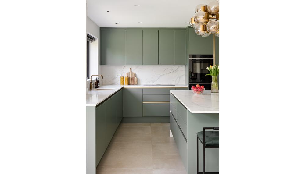 A: For the cabinetry, we choose PAD’s handleless Slab in a Eucalyptus Painted Finish from our Belgravia range adding touch of subtle sophistication with our brass handleless rail system. The Quartz 20mm Calacatta Gold worktops complemented the cabinetry. The clients wanted a handleless kitchen as they preferred the sleek look.