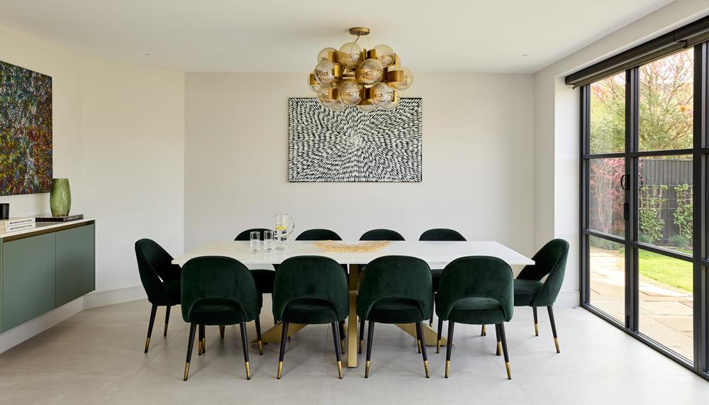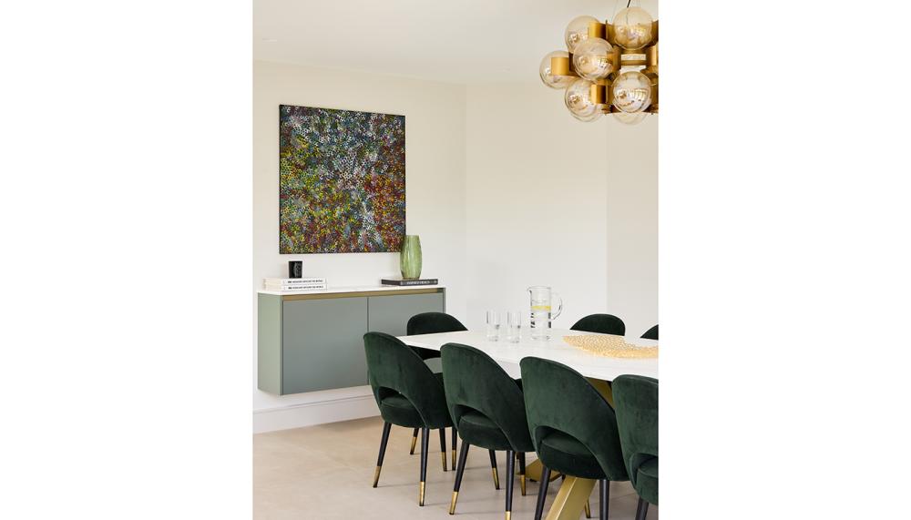 A: We wanted to ensure that the dining room furniture matched the kitchen joinery without it looking like a kitchen. For example, we designed dining table made from quartz with attractive brass legs that matched the kitchen worktops. As the clients liked harmony in the space, and for everything to be intentional without feeling overwhelming, we had to consider there was a lot of space to fill whilst maintaining the clean aesthetic. The blueprint of the space was clear when you see the space and it really helped create the zoning along with keeping the function and aesthetics to what the clients wanted.