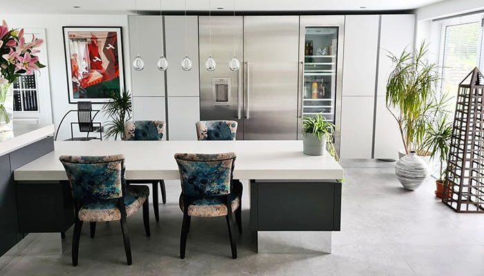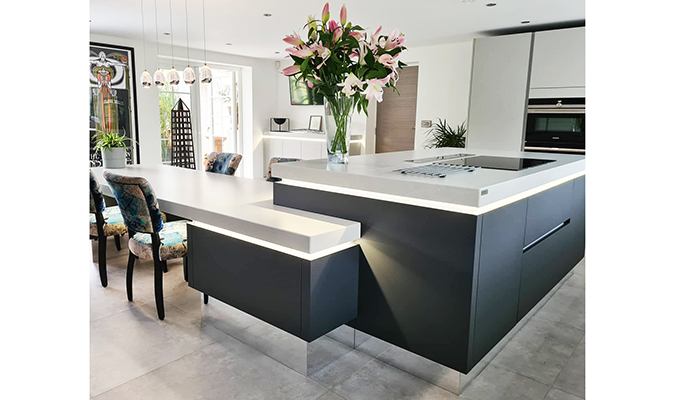 Key to pulling the layout together was the generously sized central island on two levels, with an integrated dining table rather than a breakfast bar. “The island is one of my favourite parts of the finished project,”says Matt. “It’s functional, practical, sociable and stylish, and controls the large open floor space brilliantly. Also, the mirrored plinth and panels do a fantastic job of giving a ‘floating’ illusion to the staggered levels.” It also features integrated lighting and 20mm Silestone worktops that has been mitre boxed at a 80mm height.