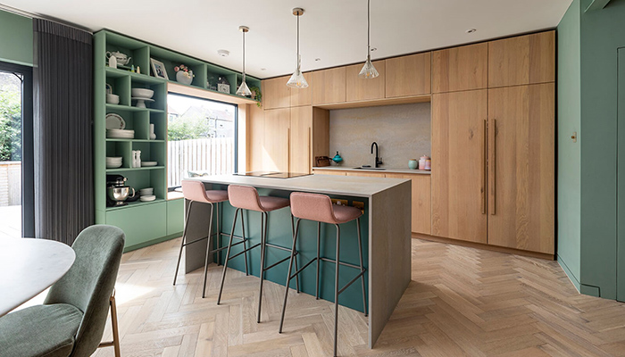 Fear not the combination of diverse design aesthetics, even if they hail from different eras or regions. Huse Kilic, a designer at Archispek Kitchens, seamlessly blended modern and warm Scandinavian influences for a West Edinburgh-based family. Caesarstone’s 4043 Primordia concrete-inspired surface played a pivotal role, tying together the natural woods, sleek lines, and refined pastel colours. The concrete waterfall island served as a practical and aesthetically pleasing centrepiece, modernising traditional wooden cabinets.