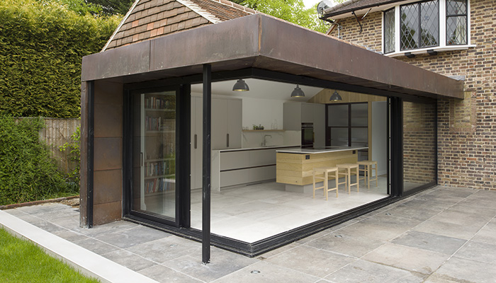The space is bathed in natural light flooding in from skylights above, and the floor-to-ceiling glass doors that lead onto the garden, which works beautifully with the combination of surfaces and materials.