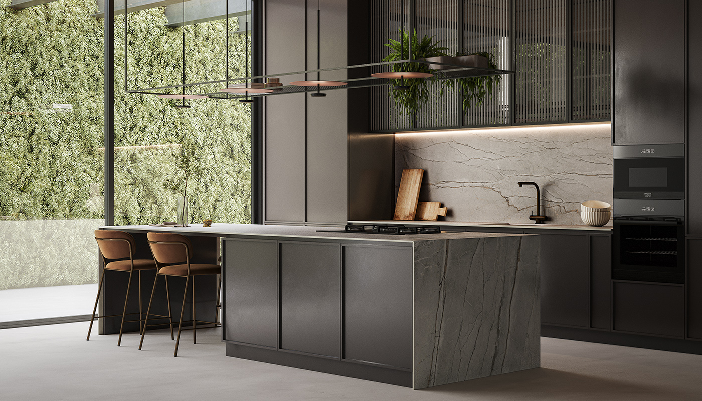 4. The distinctive flowing Arkè Shape kitchen island by Pedini features a Lapitec worktop with an Avana Vesuvio finish, a Carbone Veneered Oak snack bar, and base units in Matt Lacquered Canapa 6401. The tall units behind the island are shown in Carbone Veneered Oak.