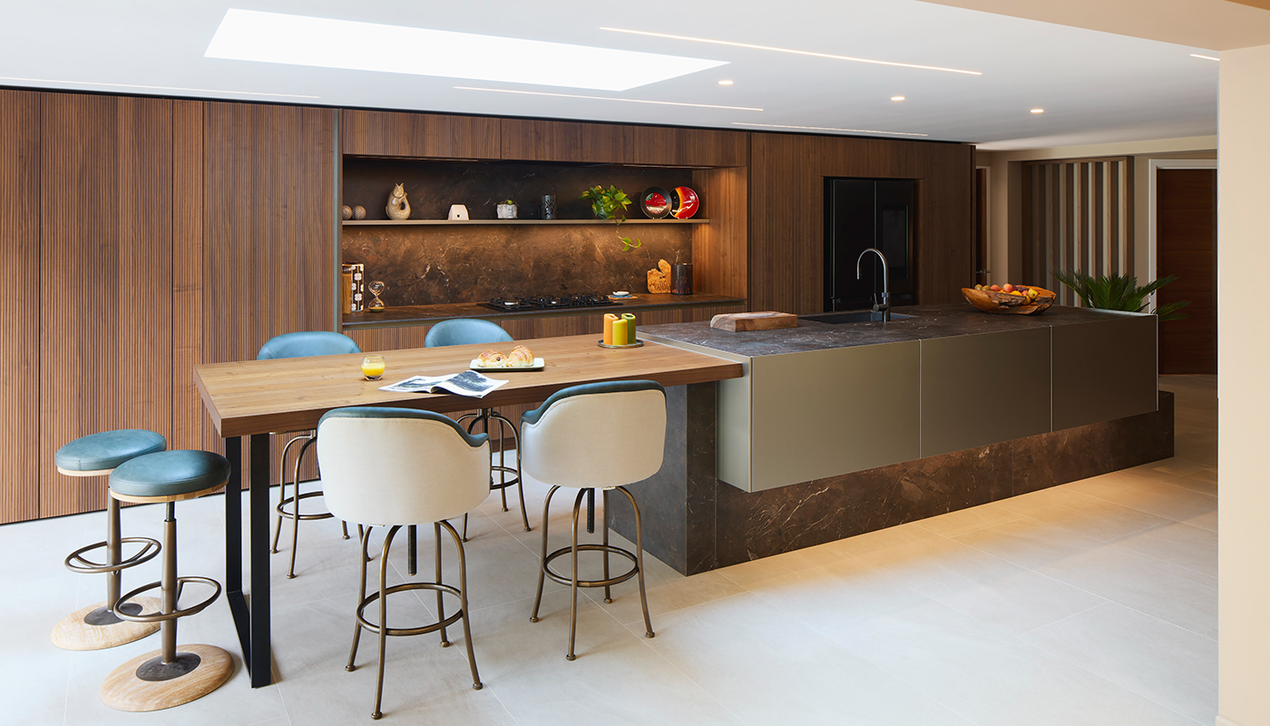 To achieve this, I designed 2 functional seating areas in the statement island – a high breakfast bar by the patio doors to offer a scenic dining experience, and a low circular booth seating area near the breakfast pantry, which provided a cosy spot for family meals. The use of different worktop heights and thicknesses on the island enhances its visual appeal while creating distinct working zones for various culinary tasks.