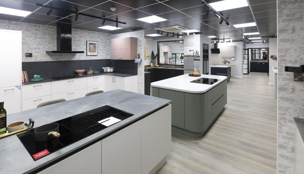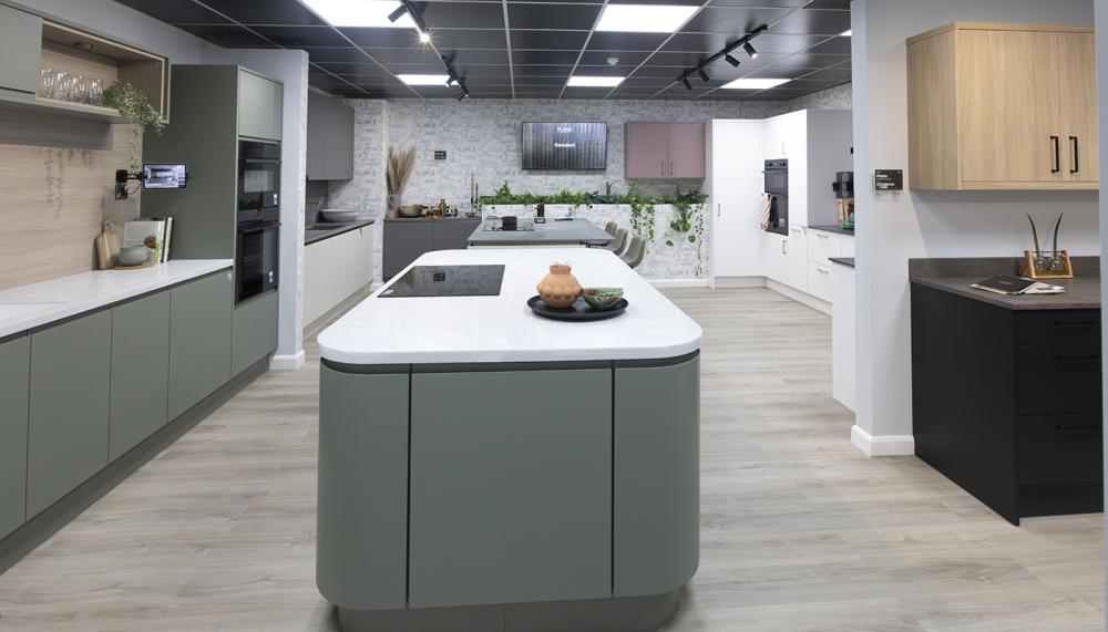 A: We’ve created a mix of aspirational and realistic roomsets that reflect the space that most designers have to work with. Paint to order continues to grow in popularity so that’s reflected in our fascia colours with a number of bespoke colours also featuring. The layout is open, allowing customers to explore in their own way with a natural flow from top to bottom but there’s no stipulated walkways.