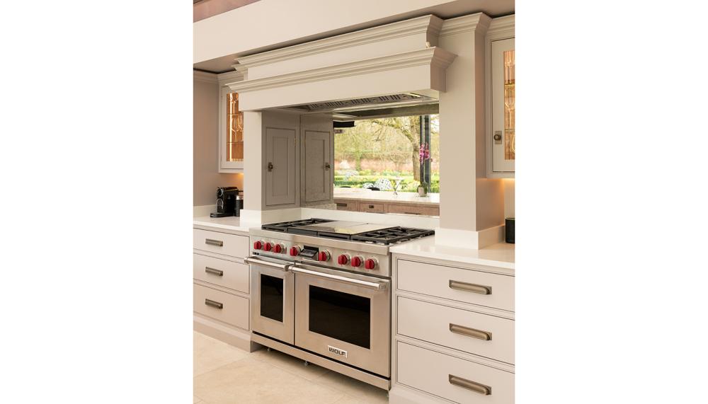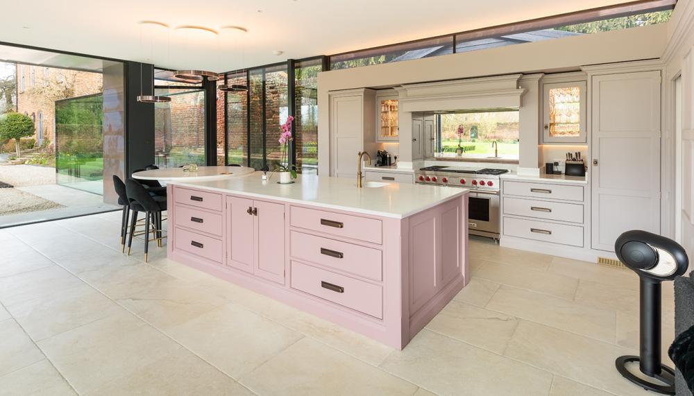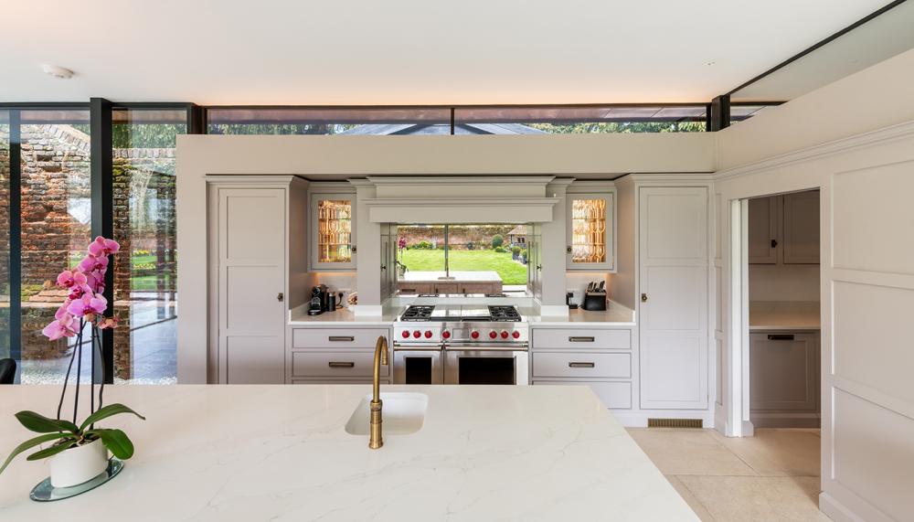 A: The client commissioned a complete new build home with a focus on timeless elegance and practical family living. Central to the brief and at the heart of the home is a bespoke kitchen, designed to maximise both storage and workspace, while delivering a grand and refined aesthetic. The brief called for 2 distinct kitchen islands, one serving as a central preparation and storage zone, and the other angled toward the garden to provide seating and an informal space for entertaining, all while taking advantage of the property’s stunning views.