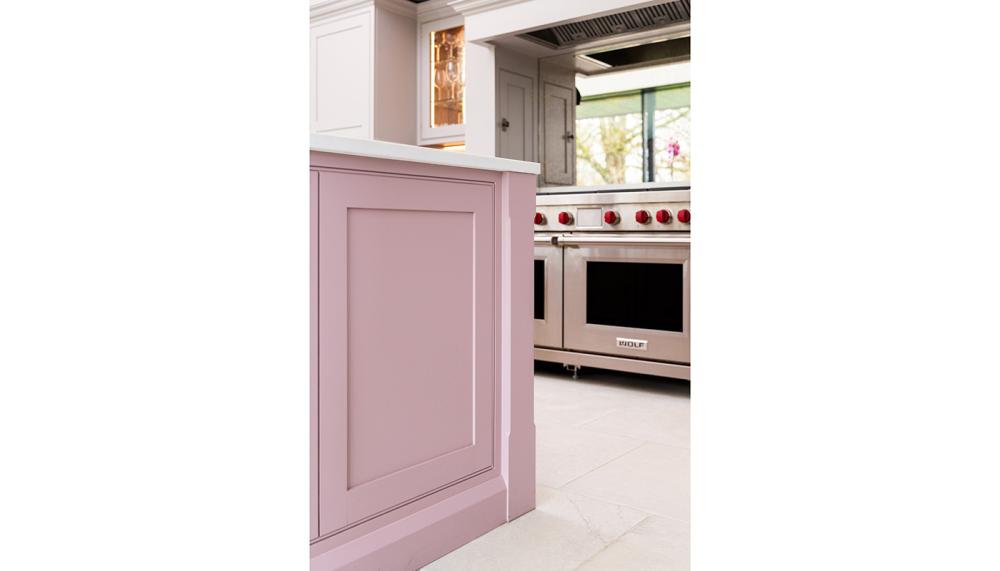 A: We implemented our Bespoke Mapesbury handleless cabinetry, to achieve a classically beautiful look that the client wanted. This refined take on classic design perfectly aligned with the client's desire for ornate yet stylish cabinetry, contributing to the overall grand feel of the property. All of our cabinetry is made by hand in our own workshop in Essex, giving us complete control over the design and manufacturing process. We take particular pride in developing custom and prototype pieces, ensuring that every kitchen we create is as unique as the people who live in it. For example, for this project, we made personalised pull-out shoe racks for the boot room and wardrobes which were tailored to particular shoes owned by the clients.