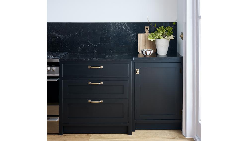 At the heart of this reimagined space is a monochromatic open-plan kitchen by bespoke kitchen makers Kate Feather, where Caesarstone's 5100 Vanilla Noir surface takes centre stage. With its rich jet-black base and creamy, off-white veining, the surface delivers a high-impact visual statement, bringing depth, drama, and elegance to the design. More than just a beautiful feature, it also sets the tone for the wider material palette and layout – anchoring the entire scheme.