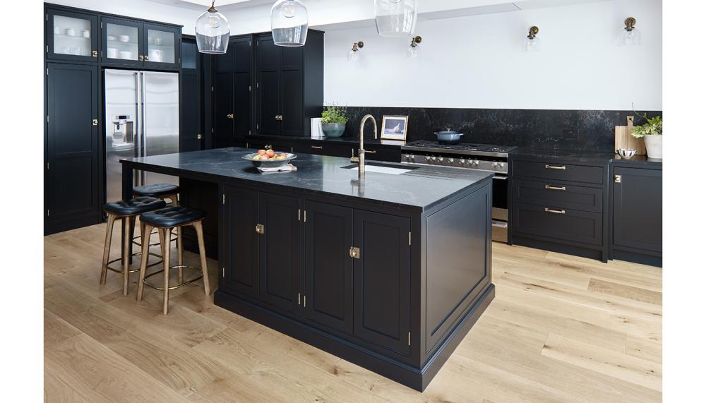 Kasia says Caesarstone’s Vanilla Noir was chosen early in the design process and used throughout – from worktops and splashback to the statement island. Visually, its dramatic veining and polished finish introduce a luxurious, high-contrast element that complements the cabinetry’s deep tones and brass detailing. Functionally, its durable, non-porous nature is engineered to perform in the most demanding kitchens.