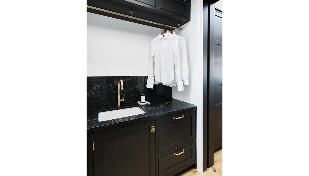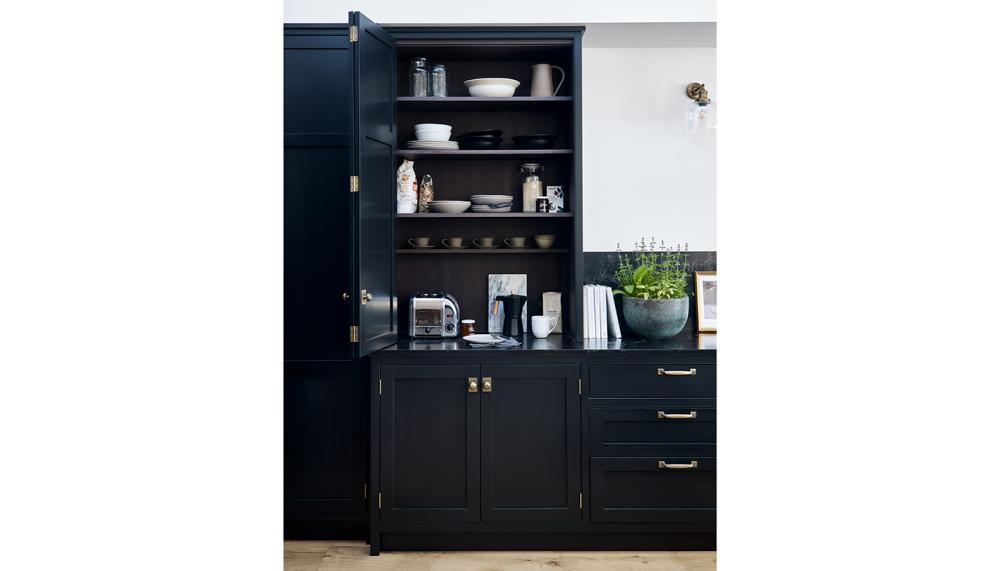 The cabinetry – painted in Little Greene’s ‘Jack Black’ – pairs beautifully with warm brass hardware from Armac Martin, while appliances from Fisher & Paykel, a cooker hood from Westin and a hot tap from Quooker were chosen for their performance and seamless integration. But it’s the thoughtful details that truly set the space apart – from the hidden breakfast station to the utility room’s brass rail for hanging laundry.