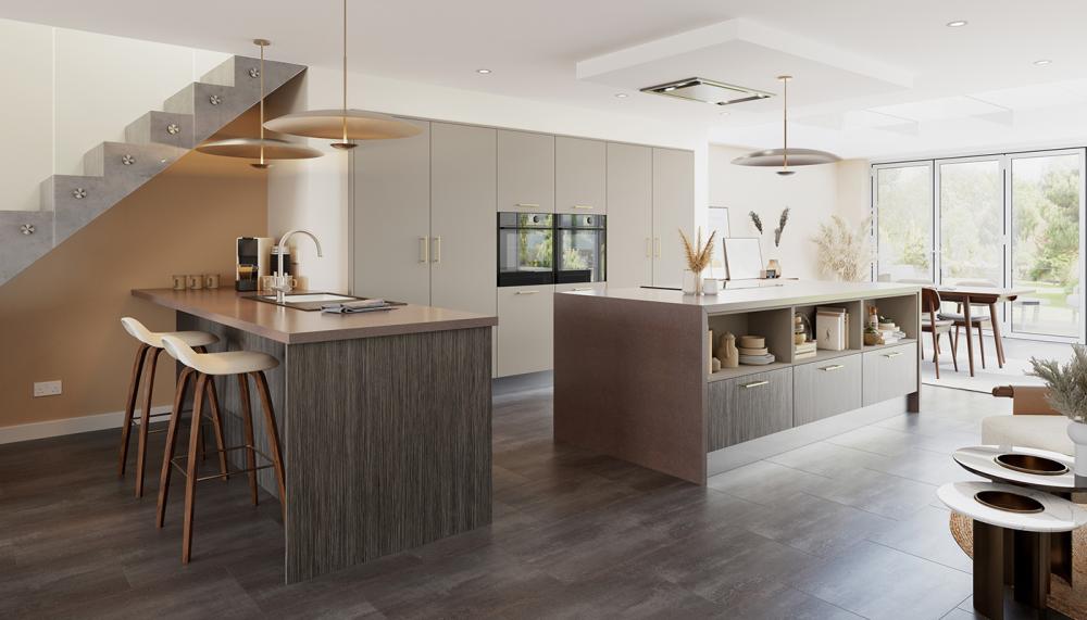 An exquisite pairing of texture and tone, Textura Sand Oak and Uno Clay exude an understated elegance with contemporary handle-less profiles. This sleek design features dual islands for a statement feel and ample storage to organise daily essentials. The seamless kitchen diner layout is designed for everyone to gather and relax, knowing everything is hidden from view.