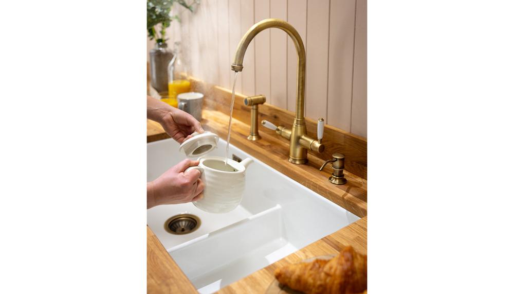 1. Traditional Texture meets Quiet Luxury – Traditional kitchen cabinets continue to evolve in 2026, with modern updates providing a new take on various design classics like painted Shaker, natural timber, and Provincial design schemes. This has led to a rise in traditional-style texture with aged finishes, decorative shapes, and signature design elements being used in the wet zone to make a centrepiece in the traditional kitchen space. Following a recent breakout for key components that echo the rising trends for fluted glass units and wall panels, vertical groove cabinetry, and ornamental hardware in 2026, the latest sinks and taps are presenting new opportunities to fully coordinate with the furniture and kitchen décor. Top products for achieving traditional texture include fluted Butler sinks in neutral colourways, traditional-style boiling water taps, and mixer taps with decorative spouts, collars, and handles in timeless finishes like brass, bronze, and nickel.